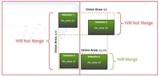 The post-detection processing layer merges the detections that were split during inference with tiling. This layer attempts to merge the detections that were split due to the image tiling algorithm, as depicted in Figure 6b.