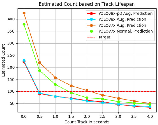 Figure 15. Estimation count of the objects in the annotated video per life span of the tracks, using three different models YOLOv7x (Normal), YOLOv7x (Augmented), YOLOv8x (Augmented), and YOLOv8x-p2 (Augmented). (The results differed from the previously retrieved results due to improvements in the code, Table 11).In Figure 15, we can observe the estimated count results of three individual models all trained under the augmented dataset. Increasing the seconds to count a track from 0 or higher subsequently decreased the total Estimated Count. To achieve equilibrium and determine the optimal point for estimating the total count of wildlife, we needed to utilize a model capable of high-accuracy inference. The most optimal scenario would involve ORACLE predicting a total Estimated Count of 100 with a total lifespan of 0.0 s to count a track; however, this means that both the object detection and tracking models would need to be 100% accurate, which is realistically not possible.False positive detections, or even miss-tracks, pose a common challenge in estimating the total count of wildlife, which is essentially considered noise. The predicted Estimated Count closest to the target was similar for the two models: YOLOv8x (93 estimated count) and YOLOv8x-p2 (90 estimated count) for 0.5 s. Furthermore, YOLOv7x trained on normal and augmented datasets produced an overestimated count compared to YOLOv8x. Meanwhile, YOLOv7x Augmented estimated the highest count compared to the rest of the models, proving the existence of a large count of false positive detections or miss-tracks. Therefore, YOLOv7x was an inferior candidate compared to the YOLOv8x models. - 2.