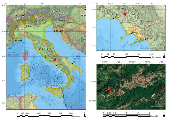 Geographical location of the case study, the Terracorpo Castle (Marzano Appio, Caserta, Italy). The red symbol indicates the position of the framed element at the Italian national, regional, and local scale.