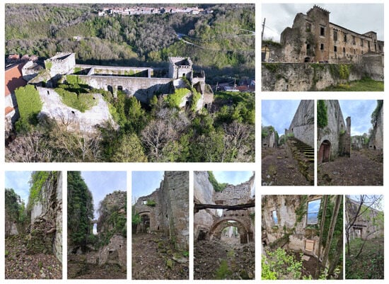 Ruins can be defined as the remains of man-made architectural structures, even if they can go beyond the merely destroyed architecture [1]. From the architectural point of view, they generally include a wide range of structures, including abandoned, historic, and crumbling buildings, showing obvious signs of decay, such as unstable walls, partially collapsed walls or roofs, with even entire rooms without roofs. Their geographic location can vary; they can be either in mountainous or lowland areas, or in lake or maritime areas. Generally, what makes them “ruins” is the poor state of preservation of the buildings themselves [2], including portions that have collapsed or are in a severe state of degradation and often abandoned (for various reasons).