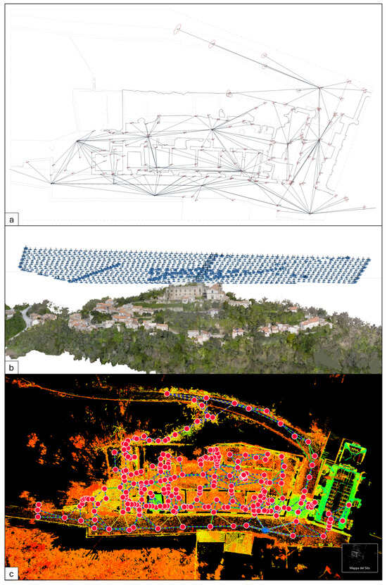 Screenshots of survey processing phases. (a) The topographic network developed during the survey to materialise a common reference system for all the data. (b) A screenshot of Agisoft Metashape Professional v. 2.0.0 with the reconstructed model of the castle. In blue is the position of the cameras. (c) A screenshot of the processing of TLS data with Leica Register 360 Plus (version 2023.0.2) software. Point cloud data are coloured in a false colour scale according to the intensity. The red circles represent the positions of the scanner along the survey execution.