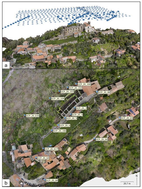 (a) The dataset used for scenario I. In this image, the mesh model is visible on top of the image; it is possible to see the camera locations. (b) The GCPs and CPs used throughout the tests performed within scenario I, positioned around the castle area.