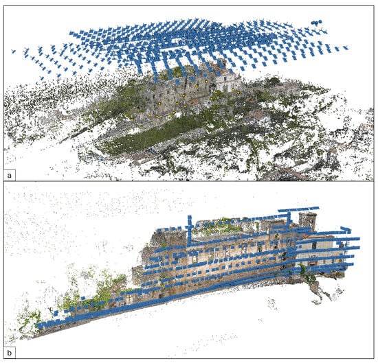 Screenshots of two photogrammetric projects for scenario II. Both figures show the positions of the cameras (in blue) and the tie points identified by the software. (a) Survey with DJI Matrice 300 RTK. (b) Survey with DJI Mavic 3 Cine.