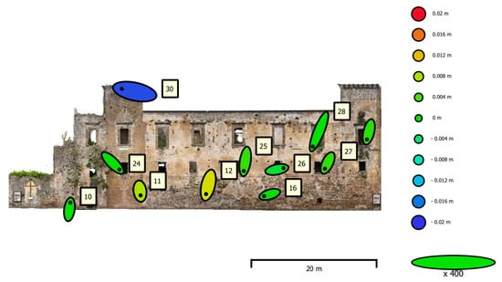 Position residuals represented as error ellipses based on GCP and CP positions for the analysed castle facade. Error ellipses are enlarged by a factor of 400.