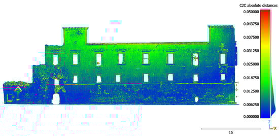 Comparison between the two point clouds of the castle’s main facade, obtained through a photogrammetric process and using two drones: DJI Matrice 300 RTK and DJI Mavic 3 Cine. The two photogrammetric point clouds were compared in CloudCompare (v. 2.13.1) using the M3C2 algorithm. The scale bar goes from −0.05 (blue) m to +0.05 m (red).