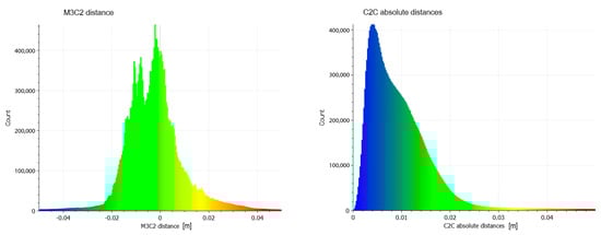Histograms related to the previous figures (Figure 9 and Figure 10), showing the distribution of distances between points in the two compared point clouds. It can be seen that both histograms, relating to the analyses with the M3C2 algorithm (left) and with the C2C algorithm (right), show a range tending to be within 2 cm.