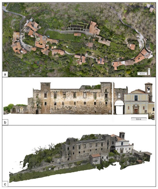 Examples of deliverables obtained through the photogrammetric process in the case study exploiting UAV data. (a) Orthophoto of the castle and its surroundings. (b) Ortophoto of the facade of the castle. (c) Three-dimensional model (texturised mesh) of the castle.