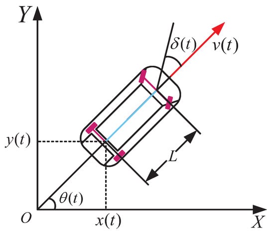 where indicates the state vector, and are the reference coordinates on the rear axle center in a geodetic coordinate system, denotes the heading angle, is the control input with the linear speed , the angular speed is , where is the vehicle wheelbase, and is the wheel deflection angle. The vehicle model is presented in Figure 1.