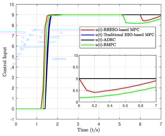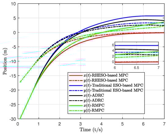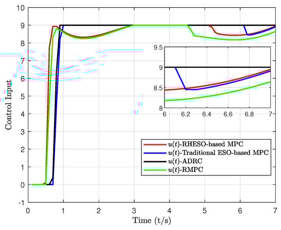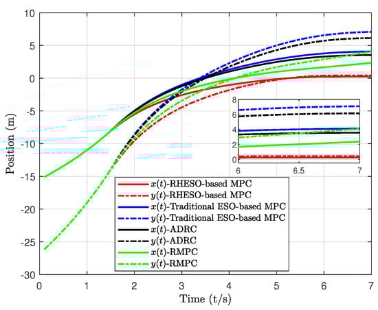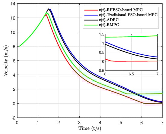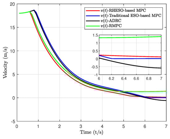 Figure 7, Figure 8, Figure 9 and Figure 10 show the impacts of the proposed RHESO-MPC and traditional ESO-based MPC, ADRC, and RMPC on AV when the initial distance and initial speed are relatively large. From Figure 7, Figure 8, Figure 9 and Figure 10, it is easy to observe that the RHESO-MPC outperforms traditional ESO-based MPC, ADRC, and RMPC in terms of position control accuracy and speed convergence accuracy when both the initial position and speed increase. As a conclusion, from Figure 3, Figure 4, Figure 5, Figure 6, Figure 7, Figure 8, Figure 9 and Figure 10, the effectiveness of the proposed method is verified.