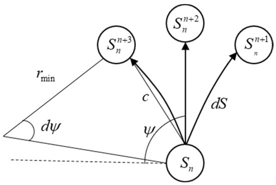 - Minimum turning radius constraint r: Due to the constraints of maneuvering conditions, the turning radius of the UAV needs to be greater than the minimum turning radius;