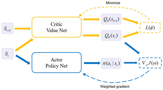 The SAC algorithm is based on the Actor–Critic (AC) framework. The AC framework contains two Deep Neural Networks (DNN), which are used to fit the Actor network and Critic network. The AC framework is shown in Figure 3, which separates the process of evaluating action value and updating strategies. The Actor network is a policy-based method responsible for making and updating decisions. The Critic network is a value-based method responsible for estimating the and of the Actor network.