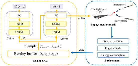 The above research demonstrates the advantages of the DRL algorithm with memory modules, but it has not yet been applied to the penetration strategy of high-speed UAVs. The Soft Actor–Critic (SAC) algorithm [33] was proposed in 2018 and has been applied with the advantages of wide exploration capabilities. Therefore, the LSTM networks are incorporated into the SAC to explore the application of LSTM-SAC in the penetration scenario of a high-speed UAV escaping from two interceptors. The main contributions in this paper can be summarized as follows: