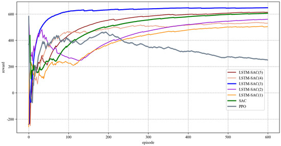 It is worth noting that the LSTM-SAC(1) with only current state inputs and the LSTM-SAC (2) with only one historical state perform lower than the classical SAC with the same inputs. It is indicated that if the input data do not have a time-dependent relationship, the LSTM networks cannot extract effective information from them, which makes the performance of the memory-based DRL worse.