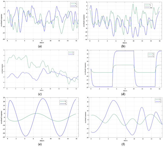 Overload commands response: (a) LSTM-SAC maneuver, (b) SAC maneuver, (c) PPO maneuver, (d) square maneuver, (e) sinusoidal maneuver of phase , (f) sinusoidal maneuver with random parameters.