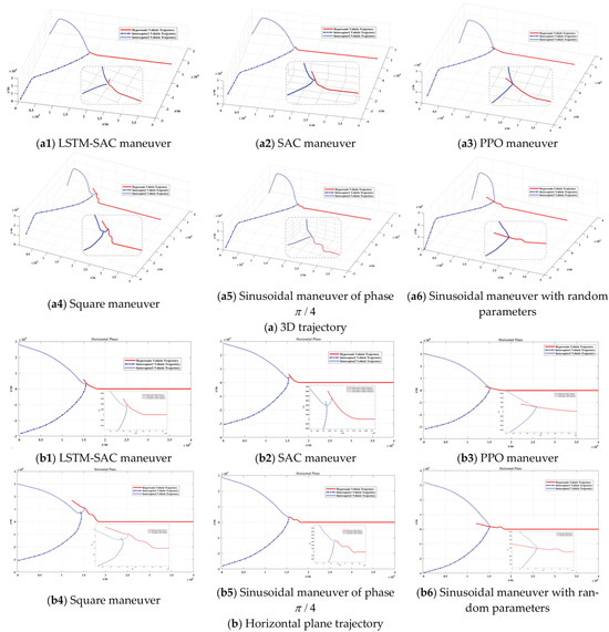 In order to verify the effectiveness of the memory-based DRL, locally generated files of intelligent decision networks based on LSTM-SAC, SAC, and PPO are saved after training convergence. Sinusoidal maneuvers with fixed or random parameters, square maneuvers, and no maneuver scenarios are used to compare with the DRL maneuver. The same simulation scenario and parameters are used in the verification.