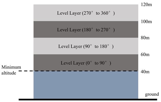 In this work, to simplify the problem, it is assumed that the MAV and UAV are flying within a layered airspace structure [32], as shown in Figure 2. The airspace is divided into several parts with each part having a constant altitude; hence, the flight height of the aircraft does not change during the cruising period.