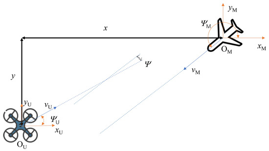 in which and are the velocities of the UAV and MAV, respectively, and are considered as constants in this work. and denote the two aircrafts’ headings and are driven by angular velocities and .