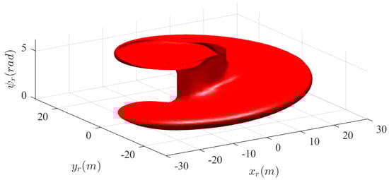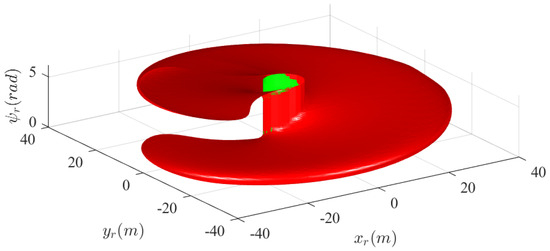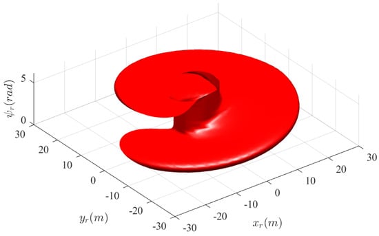 The deterministic backward reachable tube was computed based on the parameters in Table 1. In this case, the state space was set as , in which is a periodic dimension. The grid size was set to be in three dimensions. According to the ISCBRT algorithm described in Section 3.2.3, the simulation time horizon was set to be 3 s, as the term tends to be 0 as the simulation time increases. The computation result is shown in Figure 6. The simulations were conducted using Matlab R2020b with an Intel i5-13500H CPU @ 2.60 GHz and 32 GB RAM on a Windows 11 operating system.