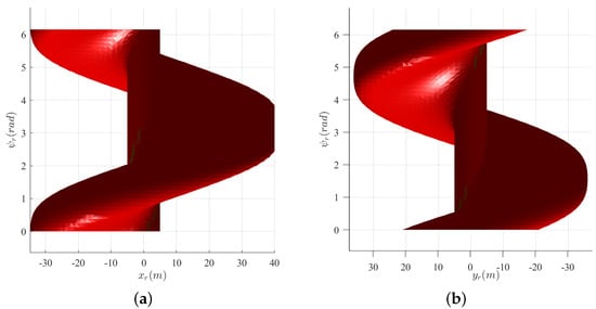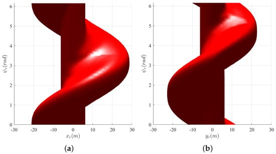 Two-dimensional projection of the isosurface with heading angle uncertainty. (a) 2D projection of the isosurface in the directions. (b) 2D projection of the isosurface in the directions.