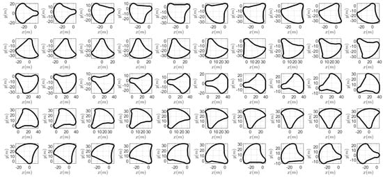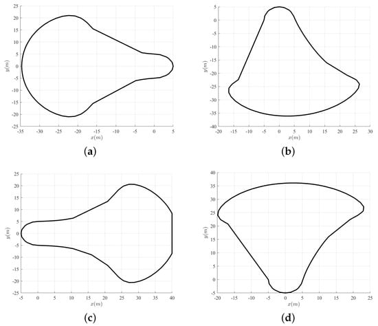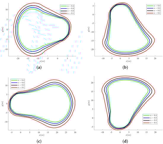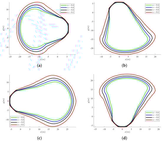 Similarly, the envelope of the tube varied with the initial relative heading angles. The slices of the tube with different risk levels are shown in Figure 18a–d.