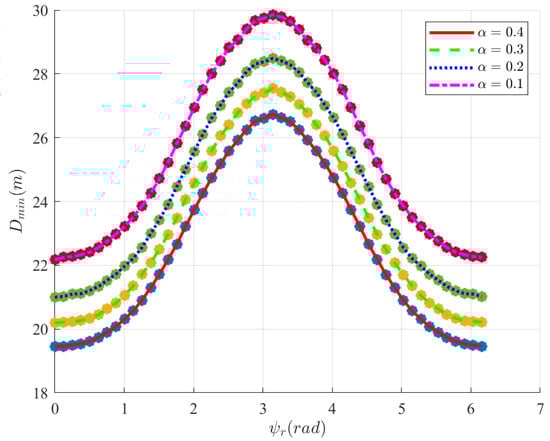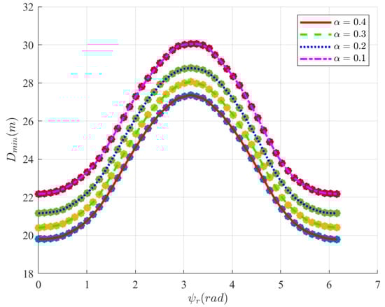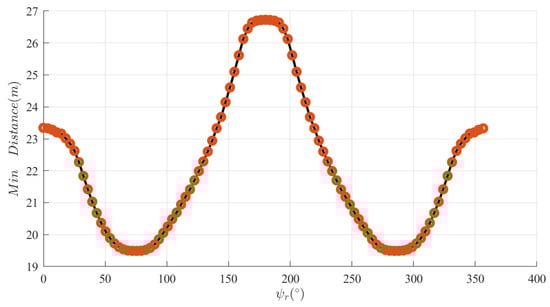 The minimum safe distances of different risk levels related to the heading angle uncertainty are shown in Figure 19. In this scenario, the minimum safe separation between two aircraft also occurs when the relative heading angle is . When the risk level is at its minimum of , the minimum separation is 29.7 m.