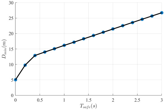 The minimum safe distances of different risk levels related to the position uncertainty are shown in Figure 15. It can be concluded that the minimum safe separation increases with the increase in the risk level. Specifically, the largest safe separation is m given the minimum response time s under a risk level of .