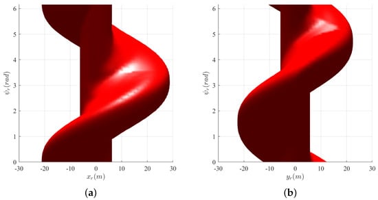 In this simulation, the standard variance in the relative angle was set as rad/. The result of the stochastic backwards reachable tube with a probability of is given below in Figure 16, and the projection figures are given in Figure 17a,b.