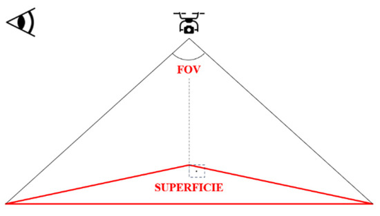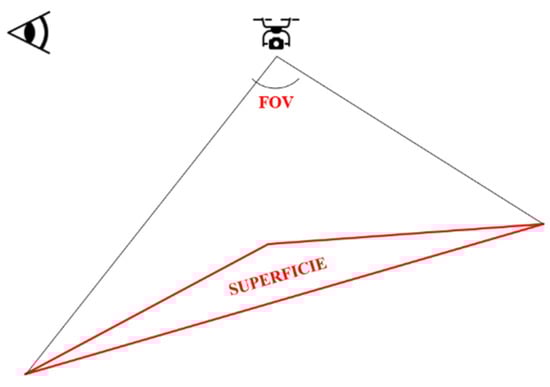 Once the field of view has been defined, the horizontal distance that the drone can cover with each image can be calculated, and from the horizontal distance and the resolution of the image, the vertical distance over the surface of the building. To do this, we apply basic geometry concepts as follows such as those shown in Figure 3: