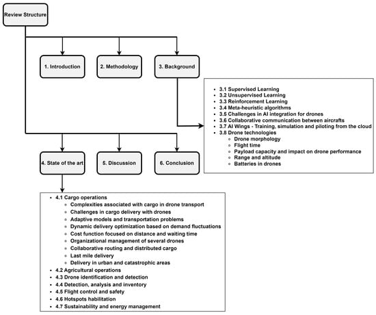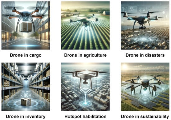 Although there are numerous papers that focus on specific aspects of the technology applied in this field, it is of particular interest to make a comprehensive compilation that addresses the various significant applications and algorithms in the field of AI and drones. The existing literature focuses on particular tasks or algorithms, such as cargo transporting [1,2] and transport paradigms [3,4], logistics [5,6], trajectory optimization [7], object detection [8,9], agricultural operations [10,11] and inventory [12,13] without offering a complete view of the global applications of AI drones (Figure 1).