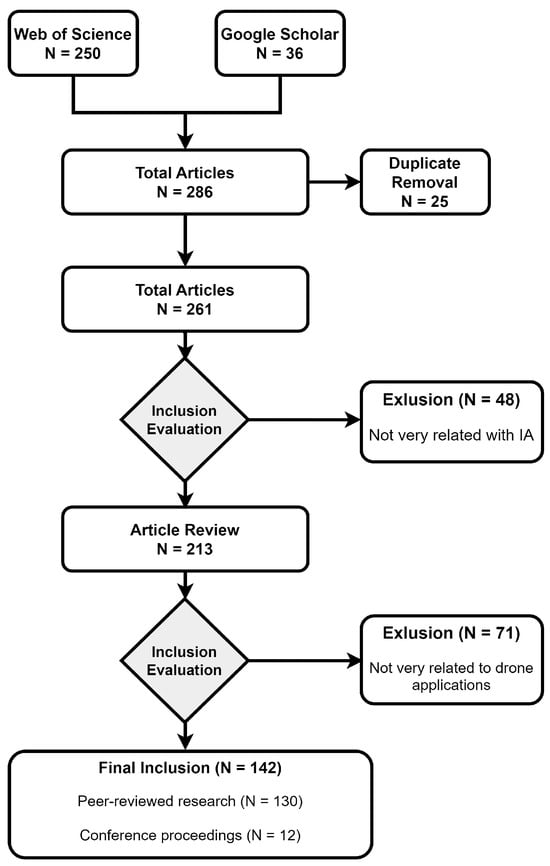 To carry out the study of the state of the art on the selected topic, a structured methodology is followed based on the search and analysis of relevant scientific articles. Queries have been made on Web of Science, IEEE (Xplore Digital Library), and Google Scholar, which have been selected for their extensive content and updated information on scientific articles. During this process, a lot of papers were identified that address the topic of study published in scientific journals and with solid methodological approaches. The detailed review of these articles allows the identification of trends, thus providing a comprehensive view of the current state of AI applications in drones.
