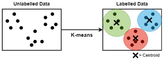 Unsupervised learning carries out the clustering of unlabeled data sets. These algorithms discover hidden data groupings or patterns without the need for any human intervention. Their ability to discover similarities and differences in information makes them the ideal solution for exploratory data analysis, cross selling strategies, customer segmentation, and image recognition. One of the most important algorithms presented in this methodology is the K-Means algorithm [17], whose theoretical basis is based on dividing a set of data into ‘k’ groups or clusters. Its main objective is to minimize the sum of the squared distances between the data points and the centroids of their respective clusters (Figure 6).