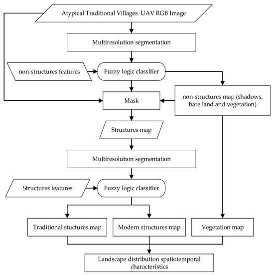 Based only on the UAV RGB images, this research proposes an atypical traditional village landscape classification model based on UAV imagery (ATVLUI) by virtue of object-oriented image segmentation and fuzzy logic membership classification, which is highly capable of identifying traditional structures in a complex scenario of atypical traditional villages according to their shapes, spectrums, and textures. After the classification procedure, the spatial information and the landscape pattern indexes of each class of surface features are calculated for analyzing the spatial distribution characteristics of traditional structures, so as to provide scientific references for the protection and overall planning of traditional structures.