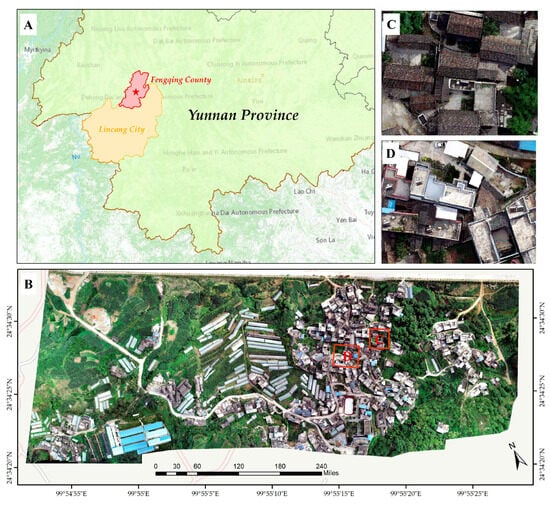 Survey region (A) for location of the survey region in Qianfeng Village, Fengqing County, Lincang City, Yunnan Province, China; (B) for survey region; (C) for traditional structures; (D) for modern structures.