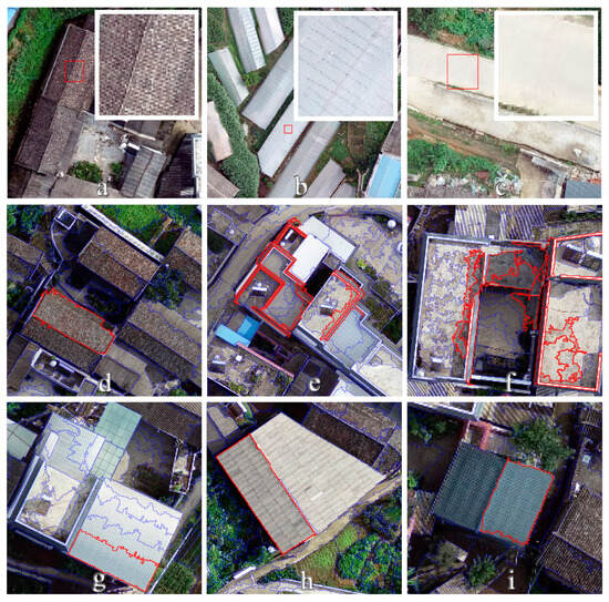 The third step is the structure extraction based on the spectrum features. After the two procedures above, there can still be some structures remaining ambiguous, which are mainly rectangular, textured roofs in red, blue, and white, with high reflectance (Figure 3g–i). Based on the spectrum differences between the remaining structures and the traditional structures, white roofs with high reflectance can be removed using the brightness and the sum of the grey values of the RGB bands (Equation (5)), red roofs can be removed using the red–green difference index (Equation (6)) and the red mean difference index (Equation (7)), and blue roofs can be removed using the blue–green difference index (Equation (4)).