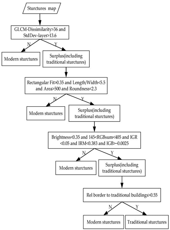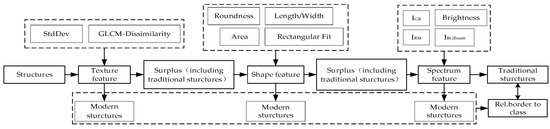 After removing the non-building objects from the UAV RS images, the patches that remain are structures. Subsequently, the differences between the traditional and modern structures, in terms of spectrum, texture, and geometrical shape, were explored one at a time, with different criteria selected or built and proper threshold parameters adopted, to separate the traditional structures from the modern ones using layered extraction. However, the problem of “different objects with the same spectrum” was noticed for the traditional and modern structures, which necessitated a sequential classification order from texture to shape and spectrum. Also, a refinement of the classification results based on the context relationships was performed.