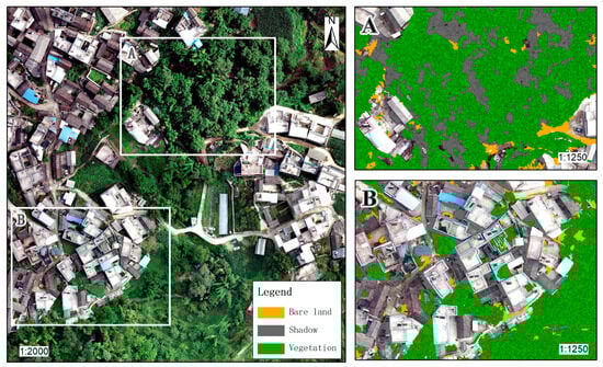 Classification of vegetation, bare land, and shadows. (A,B) are Classification result of vegetation, bare land, and shadows.