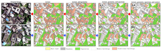 Classification of traditional and modern structures: (A,B) are original images; (A1,B1) are extracted according to texture; (A2,B2) are extracted according to texture and geometry; (A3,B3) are extracted according to texture, geometry, and spectrum; (A4,B4) are extracted according to texture, geometry, spectrum, and context.