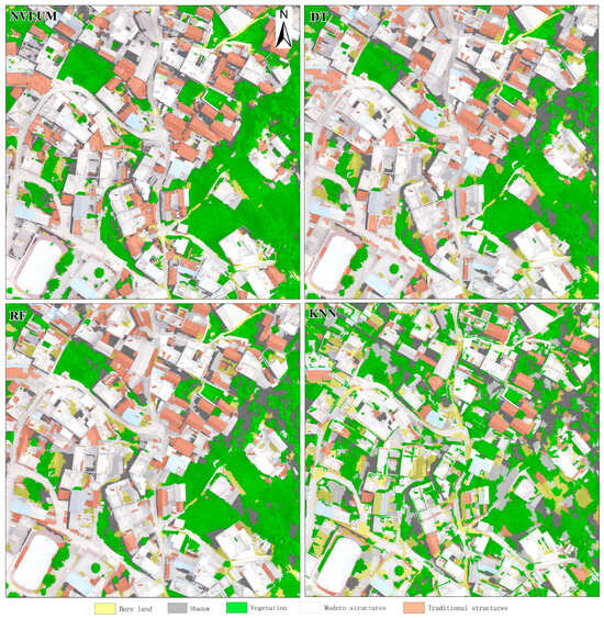 The validation results have demonstrated different techniques’ performance in classifying traditional structures and other classes of surface features (Table 3). As observed, the ATVLUI proposed is optimal in terms of traditional structure extraction accuracy (84%), OA (93%), and Kappa coefficient (0.89). According to the classification results shown in Figure 9, for traditional structures, the ATVLUI can realize clear boundaries and contours and lower rates of classification errors and mistakes than the other three techniques. In general, compared with the conventional ML classification methods, this layered multi-feature classification model is capable of extracting traditional structures and other surface features in a complex scenario at a higher accuracy based on UAV RGB images.