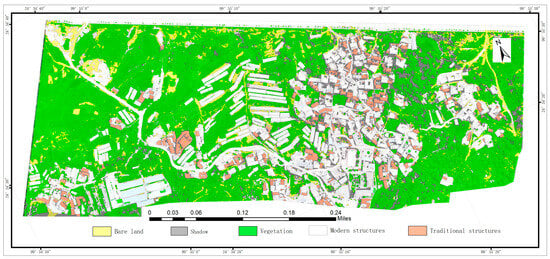 In light of the spatial distribution of the traditional structures (Figure 10), as well as the areas and proportions of the five classes of surface features (Table 4), the structures in Qianfeng Village are naturally distributed along the main road, surrounded by vegetation and farmland. The dwellings are dominated by modern structures, which mix with scattered traditional structures. Agricultural greenhouses can be seen in the farmland. Table 4 shows that the vegetation possesses the largest area proportion, followed by the modern structures, bare land, shadows, and traditional structures. The structures account for 33.94% of the village’s total area. The number of traditional structures is 202, accounting for 13% of the total number of structures.