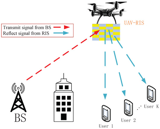 As shown in Figure 1, the system model consists of K single-antenna users indexed by set , a UAV-RIS, and a single-antenna ground BS. Suppose that the coordinates of the BS and the k-th user are respectively expressed as and . The horizontal coordinate of the UAV is . The phase shift matrix on the diagonal of the RIS is expressed as , where M denotes the number of reflective elements.