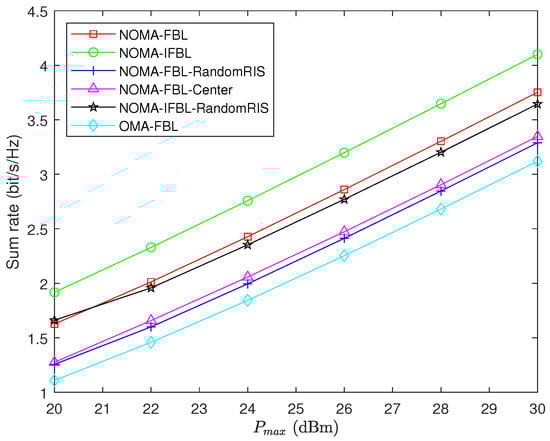The trend of the sum rate of the system as the maximum transmit power of the BS is shown in Figure 3. It can be observed that the sum rate of the six schemes increases with the increase of . This is because the BS allocates more power to each user to achieve a higher sum rate. In addition, the sum rate of the proposed NOMA-FBL algorithm is higher than that of other algorithms except NOMA-IFBL, proving the NOMA-FBL algorithm’s effectiveness. The NOMA-IFBL and NOMA-FBL algorithms for optimizing RIS phase shift are superior to the corresponding NOMA-IFBL-RandomRIS and NOMA-FBL-RandomRIS algorithms, indicating the effectiveness of RIS gain in improving the URLLC systems. For the UAV-RIS-assisted URLLC systems, optimizing the UAV-RIS position can greatly improve the sum rate of the system because adjusting the UAV-RIS position can improve the user’s channel quality and update the NOMA decoding order. Compared to the NOMA-FBL-RandomRIS, NOMA-FBL-Center, and OMA-FBL algorithms, the NOMA-FBL algorithm has improved by , , and , and the sum rate of NOMA-FBL and NOMA-IFBL-RandomRIS algorithms reaches and of the NOMA-IFBL algorithm, respectively, when is .