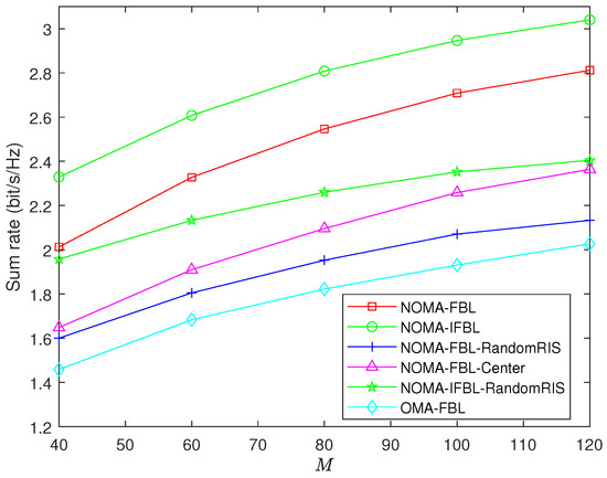Figure 4 presents the performance of the sum rate of the system versus the number of RIS sub-surfaces M. As M increases, the sum rate of the six algorithms increases. However, the gap between the sum rate of the optimized phase shift algorithm and the random phase shift algorithm is becoming increasingly significant. The reason is that the higher reflection gain can be achieved through the reflection of a quantity of RIS sub-surfaces, and the larger the number of M, the greater the influence on the RIS reflection channel. The proposed NOMA-FBL algorithm improves the sum rate with respect to NOMA-FBL-RandomRIS, NOMA-FBL-Center, and OMA-FBL algorithms by , , and when M equals 80. The sum rate gap between the NOMA-IFBL algorithm and the NOMA-FBL and NOMA-IFBL-RandomRIS algorithms is and bit/s/Hz, respectively.