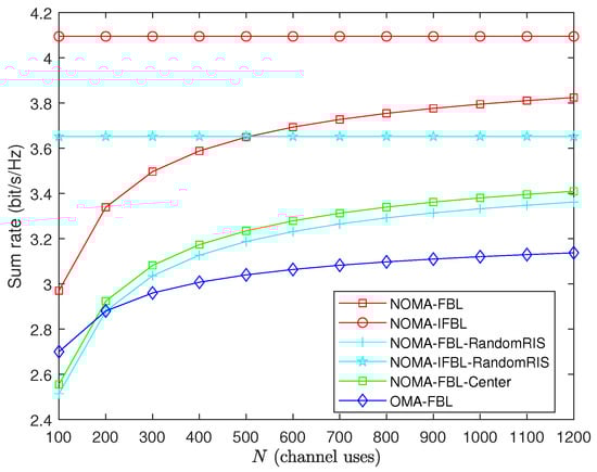 Figure 5 illustrates the relationship between the sum rate of the system and the packet length N under various schemes. The figure demonstrates that the sum rate of all short-packet transmission schemes increases with the increase in packet length and gradually approaches the ideal IFBL transmission scheme. A notable observation is that the trend of sum rate growth slows down as packet length increases. This implies that improving throughput performance at the expense of higher latency is less effective beyond a particular threshold of packet length. In addition, the sum rate of the proposed NOMA-FBL algorithm is higher than that of the OMA-FBL algorithm for any packet length. This indicates that using NOMA technology in short-packet transmission under the same latency conditions can achieve a superior sum rate compared to OMA, and NOMA can effectively reduce latency. When packet length N is 600, the sum rate of the system obtained by the NOMA-FBL-RandomRIS, NOMA-FBL-Center, and OMA-FBL algorithms are about , , and of the NOMA-FBL algorithm.
