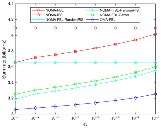 As shown in Figure 6, when increases from to , the system sum rate of the FBL scheme increases. Generally speaking, . As approaches 0.5, the sum rate difference between the FBL scheme and its corresponding IFBL scheme decreases. This is because the is monotonically decreasing in . Consequently, to boost the sum rate under the FBL scheme, a certain degree of reliability must be compromised. When , the sum rates obtained by the NOMA-FBL and NOMA-FBL-RandomRIS algorithms account for , and of NOMA-IFBL and NOMA-IFBL-RandomRIS respectively.