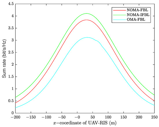Figure 7 illustrates the impact of the UAV-RIS position on NOMA URLLC system performance. We set the minimum user rate equals 0 and the UAV-RIS y-axis to 0 m, with a height of 80 m. The NOMA decoding sequence is optimized according to Equation (6), and the remaining variables are optimized according to Algorithm 1. As can be seen from the figure, the sum rate of the three algorithms first increases with the movement of the UAV-RIS and then gradually decreases. When the UAV-RIS is placed between the base station and the users, the system performance is better, indicating a relationship between channel gain and the distance of the UAV from the base station and users. It is noteworthy that the system performance is best for the NOMA-IFBL, NOMA-FBL, and OMA-FBL algorithms when the UAV position is at m, m, and m, respectively.