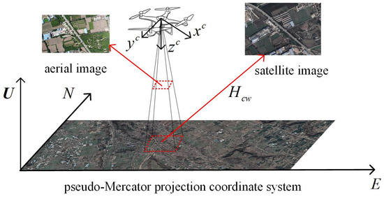 The aerial image can be transformed into a geographic plane coordinate by applying the homography matrix , extracting a rectangular region in the geographic plane coordinate system for intercepting the satellite image. Subsequently, utilizing the homography matrix, the captured satellite image is projected onto the pixel coordinate of the aerial image. Figure 5 illustrates the flowchart depicting satellite image extraction.