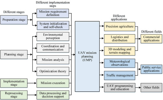 UMP involves knowledge from several disciplines, such as computer science, control theory, communication technology, and artificial intelligence [18,19,20], and with the rapid development of UAV technology and the continuous expansion of application scenarios, the application of UMP in various fields has become increasingly widespread. This section first introduces the different stages and execution processes of UMP, then explores the application of UMP in various areas.