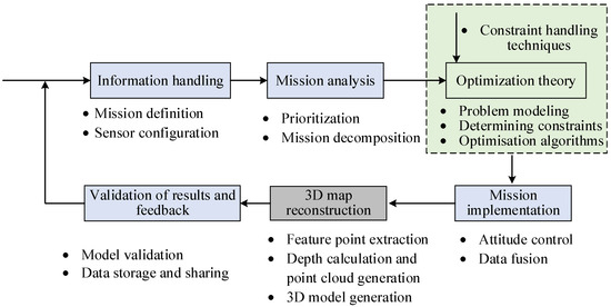 Figure 1 illustrates the different execution stages of UMP, the execution process, and its specific applications in various fields. UMP can be divided into four main phases: preparation, planning, execution, and post-processing. The preparation stage mainly involves the definition of mission requirements, initialization, and self-testing of the UAV; these steps ensure that the mission requirements are clear and that the UMP system is able to function properly. The planning stage focuses on environmental awareness, cooperative communication, mission analysis, and optimization theory and uses advanced algorithms and optimization techniques to develop efficient and safe mission scenarios that meet specific optimization objectives and constraints. The execution phase involves mission implementation, real-time monitoring, and dynamic adjustment, which ensure that the UAV performs the mission as planned and can adjust the planning scheme in real time. The reprocessing stage involves data processing, result analysis, and report generation, which provide optimization recommendations for the UMP system through in-depth analysis of data from the execution process. Currently, UMP is used in a variety of fields: in the field of agriculture, UMP is used for precision agriculture and crop monitoring [21]; in the field of environmental monitoring, UMP is used to collect and analyze data in real time to evaluate environmental changes [22]; and in the field of logistics and distribution, UMP ensures that parcels are delivered to their destinations efficiently and accurately [23]. In addition, UMP plays a crucial role in areas such as search and rescue and infrastructure inspection [24,25]. The efficient execution process of UMP not only improves the efficiency and safety of the application field but also enhances the accuracy and resource utilization of the executed missions. In this section, the execution process of UMP is elaborated in detail, using the 3D map reconstruction technique in UMP as an example, as shown in Figure 2.
