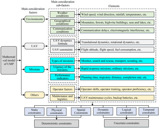 This section first introduces the mathematical model of UMP and its main considerations, details the classification of UAV constraints, and classifies UAV constraints into deterministic constraints and uncertainty constraints. Then, the current classical algorithms used in UMP are summarized, classified, and briefly described.
