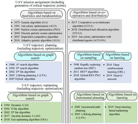 UMP based on traditional optimization algorithms uses different strategies and methods to find optimal or near-optimal planning solutions in a search space [46,47,48,49]. UMP based on traditional optimization algorithms is not only able to effectively cope with some types of mission requirements and environmental constraints but also ensures that UAVs are efficient and reliable during execution. We illustrate the application scope of UMP based on traditional optimization algorithms through the classification of UAV mission assignment, UAV trajectory planning, and UAV trajectory replanning, as shown in Figure 4.